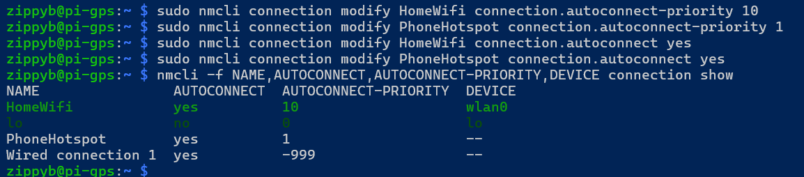 sudo nmcli connection modify "HomeWiFi" connection.autoconnect-priority 10